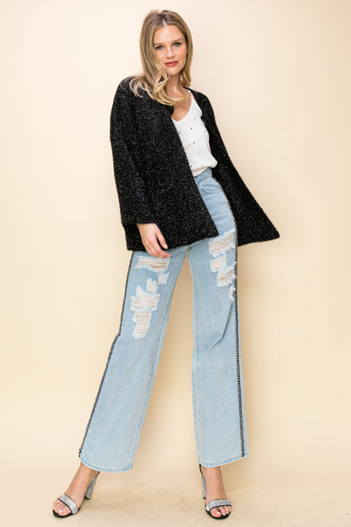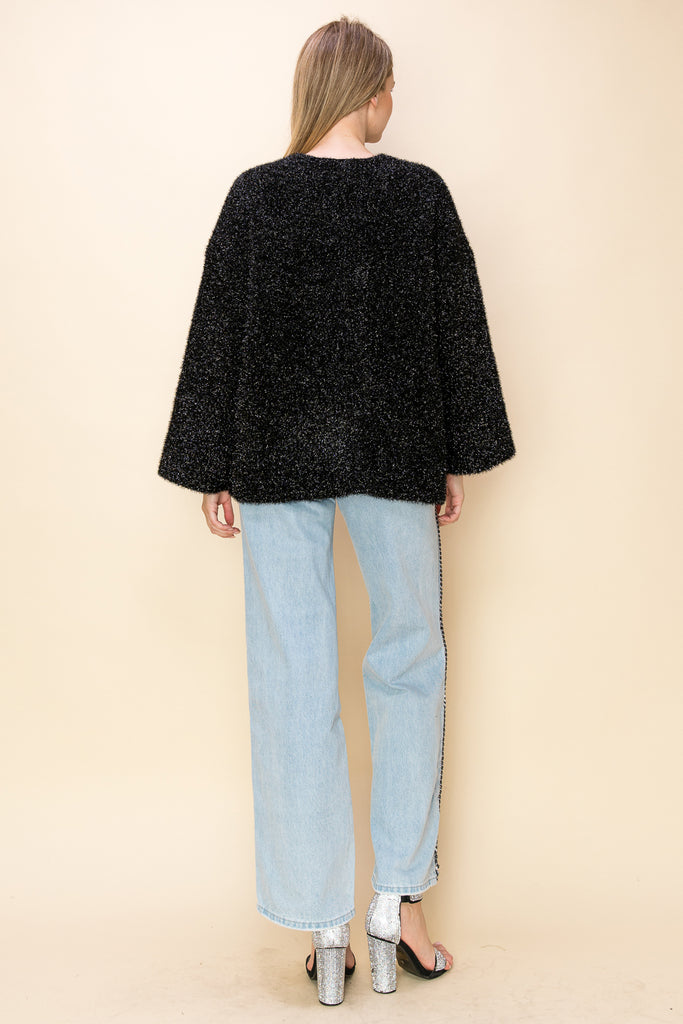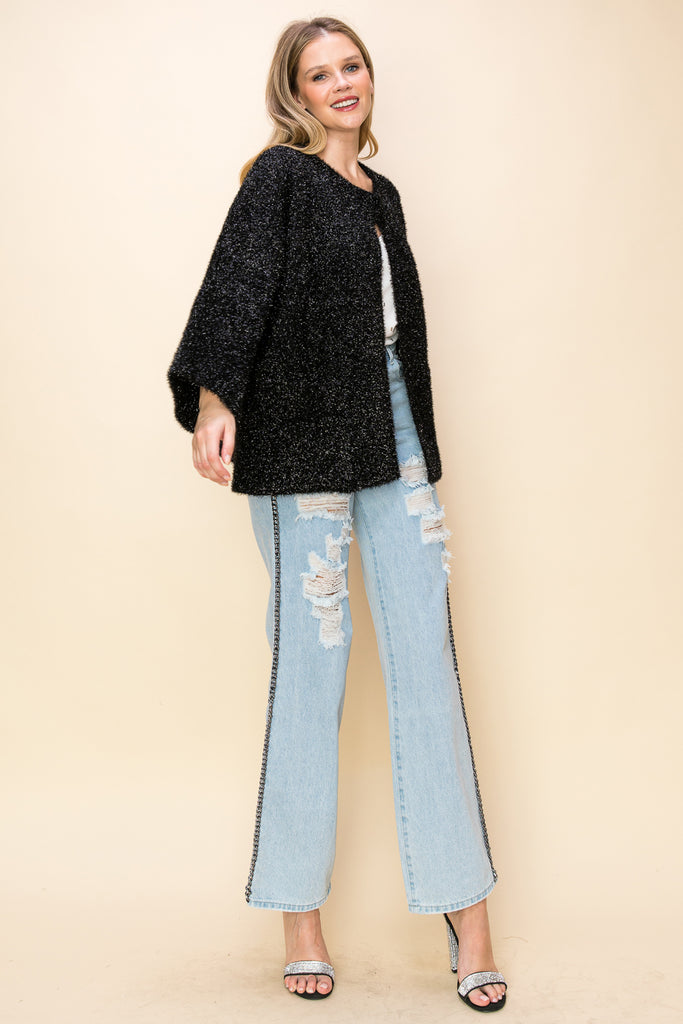 A STUNNING black Coatigan that will finish all your holiday looks. This substantial knit is woven with full on sparkle, has an open front, wide sleeves and pockets. Can we suggest a sparkly brooch at the neck to finish your ultimate holiday piece?
