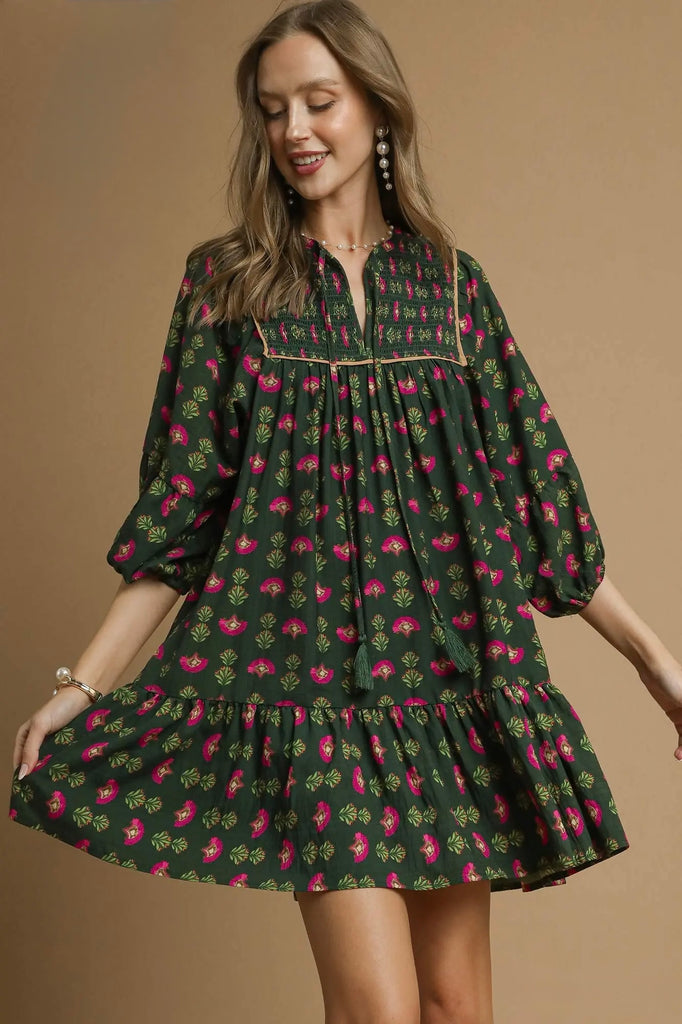 Our new boho dress is a dream in the freshest greens and sweetest pinks. We especially love the trimmed smocking at the front. The length is perfect for a three season dress. Get ready to reach for this piece often. Unlined