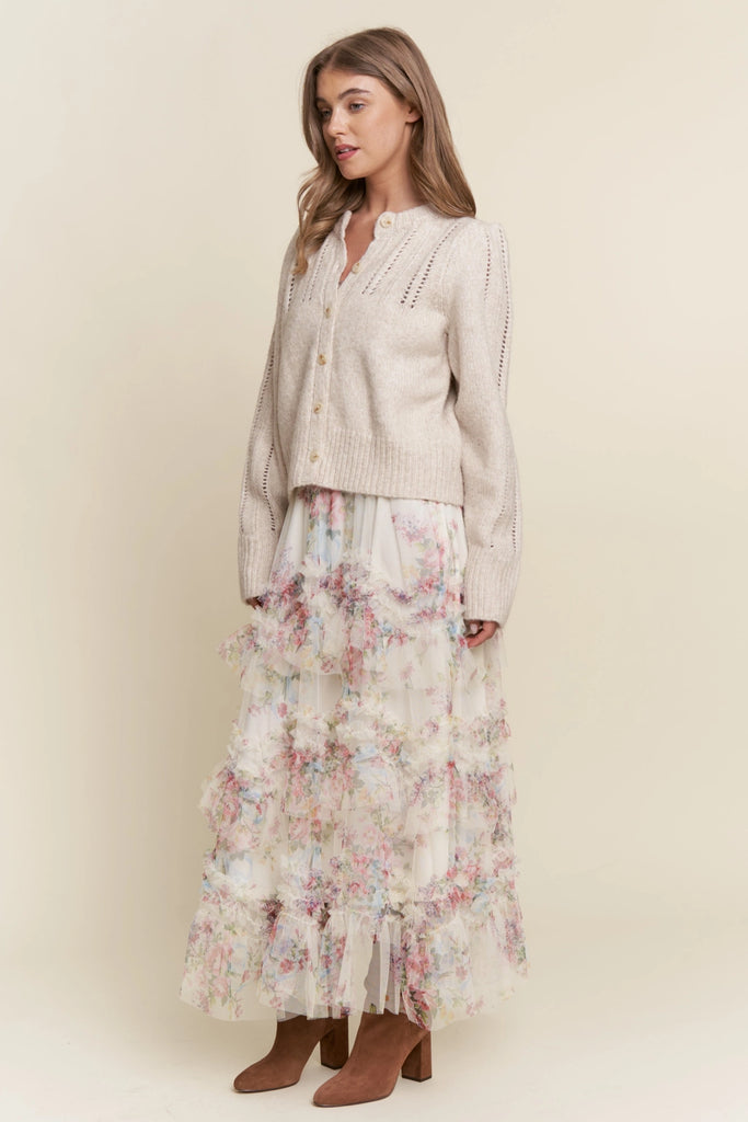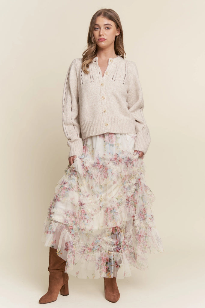 The delicate details make this cardigan a stand out. We love the pattern, the puff sleeves and the grosgrain detail on the button placket. So very soft and feminine. No itch.