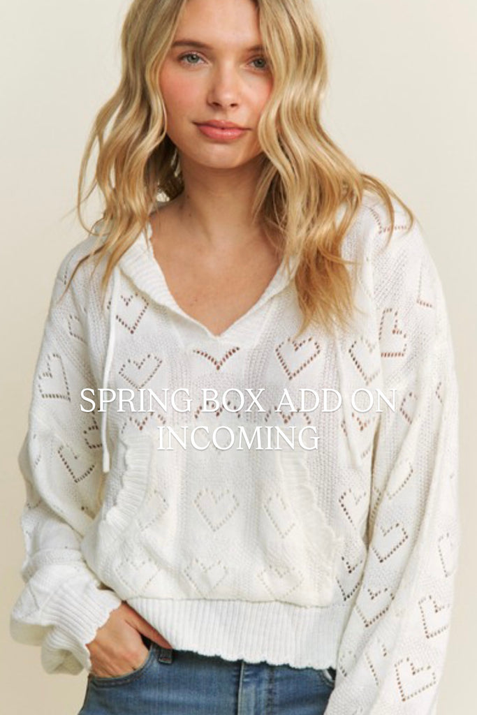 We are also offering an ADD on this time around. The knit Heart hoody is a sweet addition to any wardrobe. With an all over heart pattern and a scallop knit trim, this might be the prettiest pullover we’ve ever sold. The knit Heart hoody can be added to your box for the special price of $58.00. (value of $88.00)